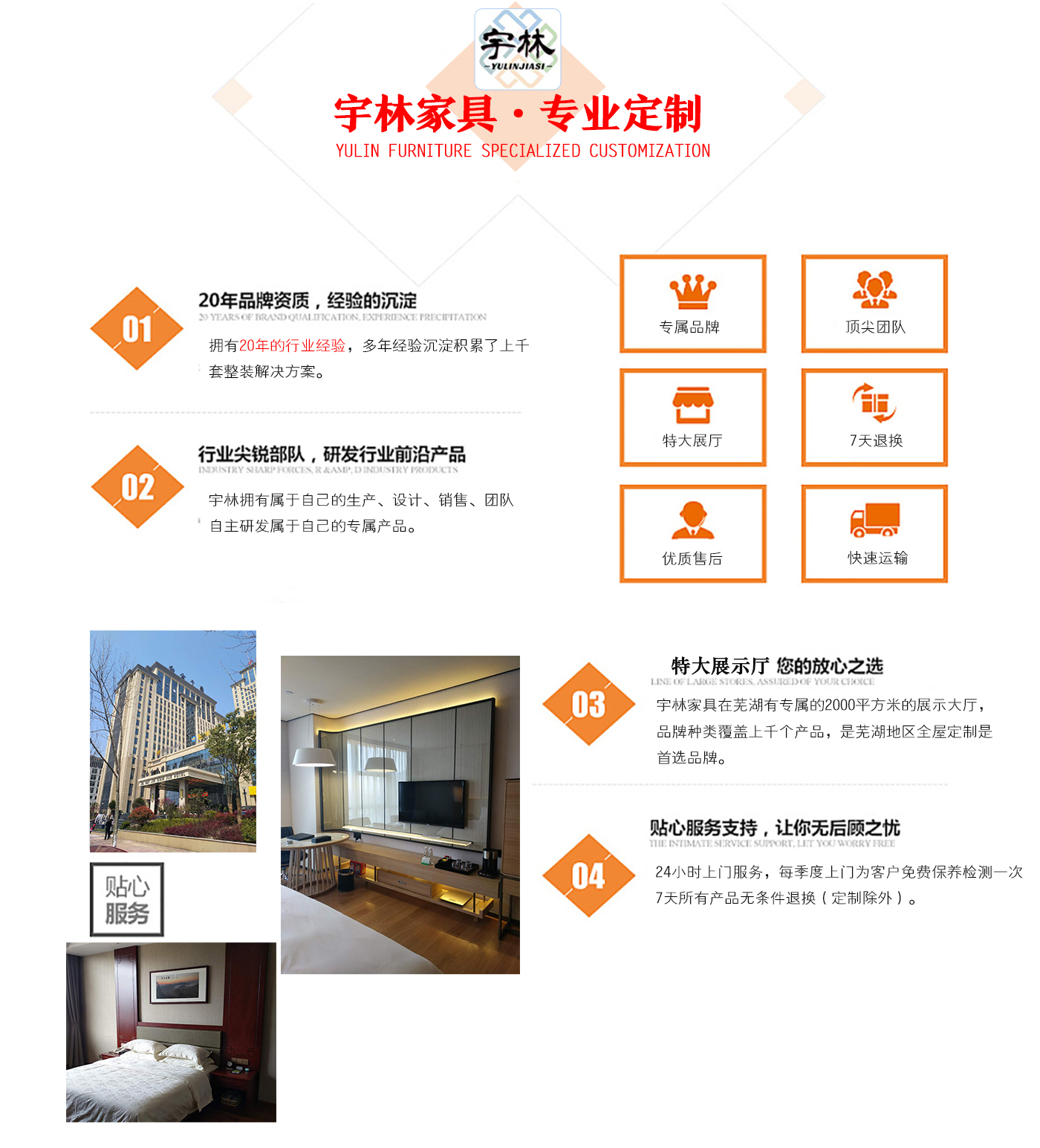 蕪湖宇林工貿有限公司創建于1996年,位于蕪湖高新技術開發區南區,占地面積13000余平方米。是一個集研發、設計為一體的綜合性公司,公司主營整體家居定制、酒店家具定制、娛樂場所配套家具以及軟體系列,團隊,銳意革新、進去不息的理念,逐漸成為蕪湖家具行業的生產廠家,并在2006年注冊了“宇林”牌商標。宇林品牌家具依現代與古典相結合的多種實木家具、實木貼皮家具。家具做工精細,多用人工雕刻;其自然、典雅的風格在很大程度上引導著人...